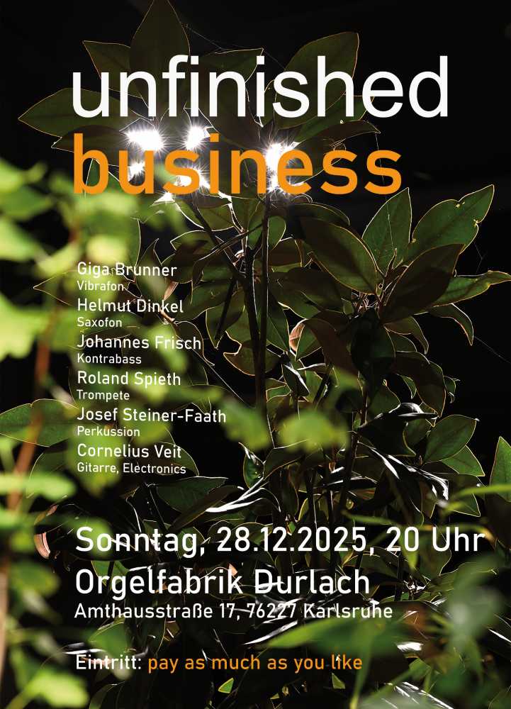 28.12.2025 Unfinished Business spielt das schon traditionelle Konzert zum Jahresausklang in der Orgelfabrik, Karlsruhe-Durlach um 20 Uhr.